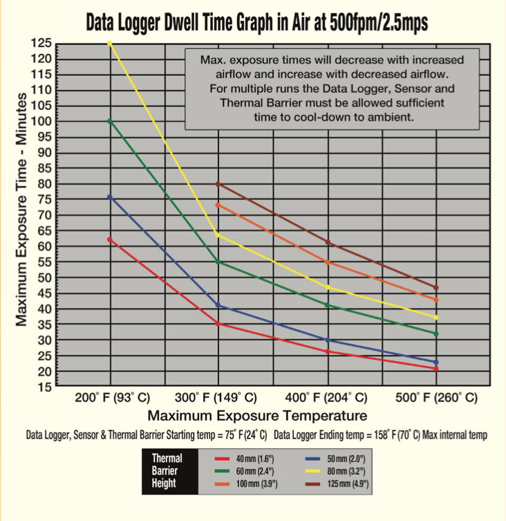The Digital Humidity Sensor Dwell Time Graph is used to determine what size thermal barrier is required for safe operation. The thermal barrier performances for the 6 standard sizes are displayed.