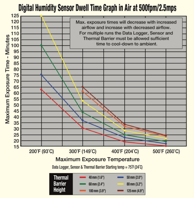 The length of time the Humidity sensor can be in a heated process is dependent on process temperature and airflow. The Digital Humidity Sensor has a different Time vs.Temperature graph for the Thermal Barriers and this graph should always be the determining factor when using this sensor.